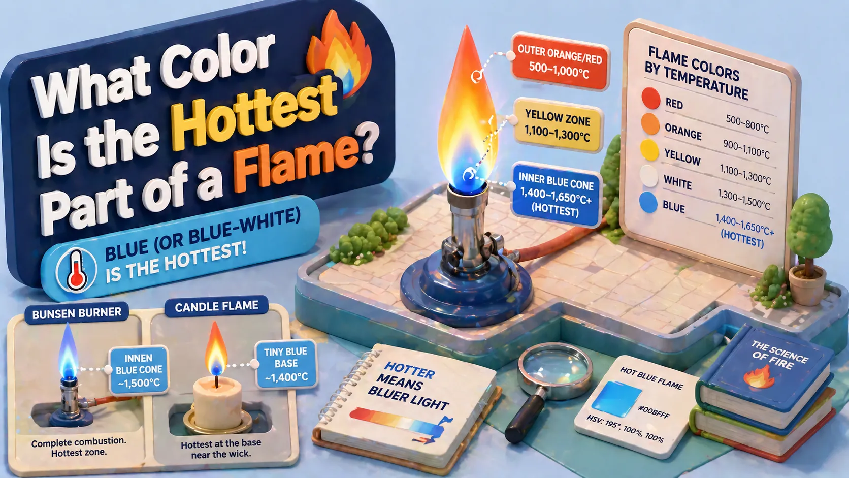 The hottest part of a typical flame is blue (or blue-white), reaching temperatures around 1,400–1,650°C (2,550–3,000°F) in complete combustion. This occurs where fuel mixes efficiently with oxygen. Orange and yellow flames are cooler (around 1,000–1,200°C), while red is the coolest visible part. The color comes from blackbody radiation and excited chemical particles. Understanding this helps train your eye for precise color temperature perception — a skill directly useful in Dialed Color Game when matching subtle hue and value shifts.