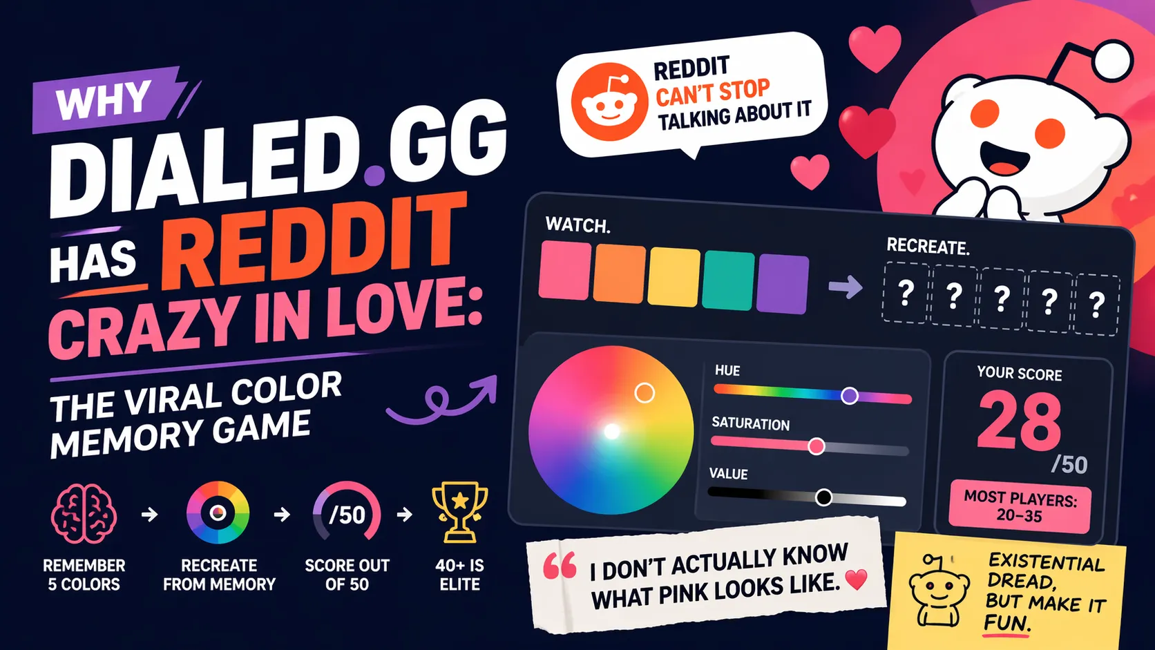 Dialed.gg is a viral color memory game where you see five colors for a few seconds each, then recreate them as accurately as possible on a color picker. Reddit is crazy in love with it because it's deceptively simple, shockingly difficult, and hilariously humbling—most players score way lower than they expect, sparking endless score-sharing and memes.